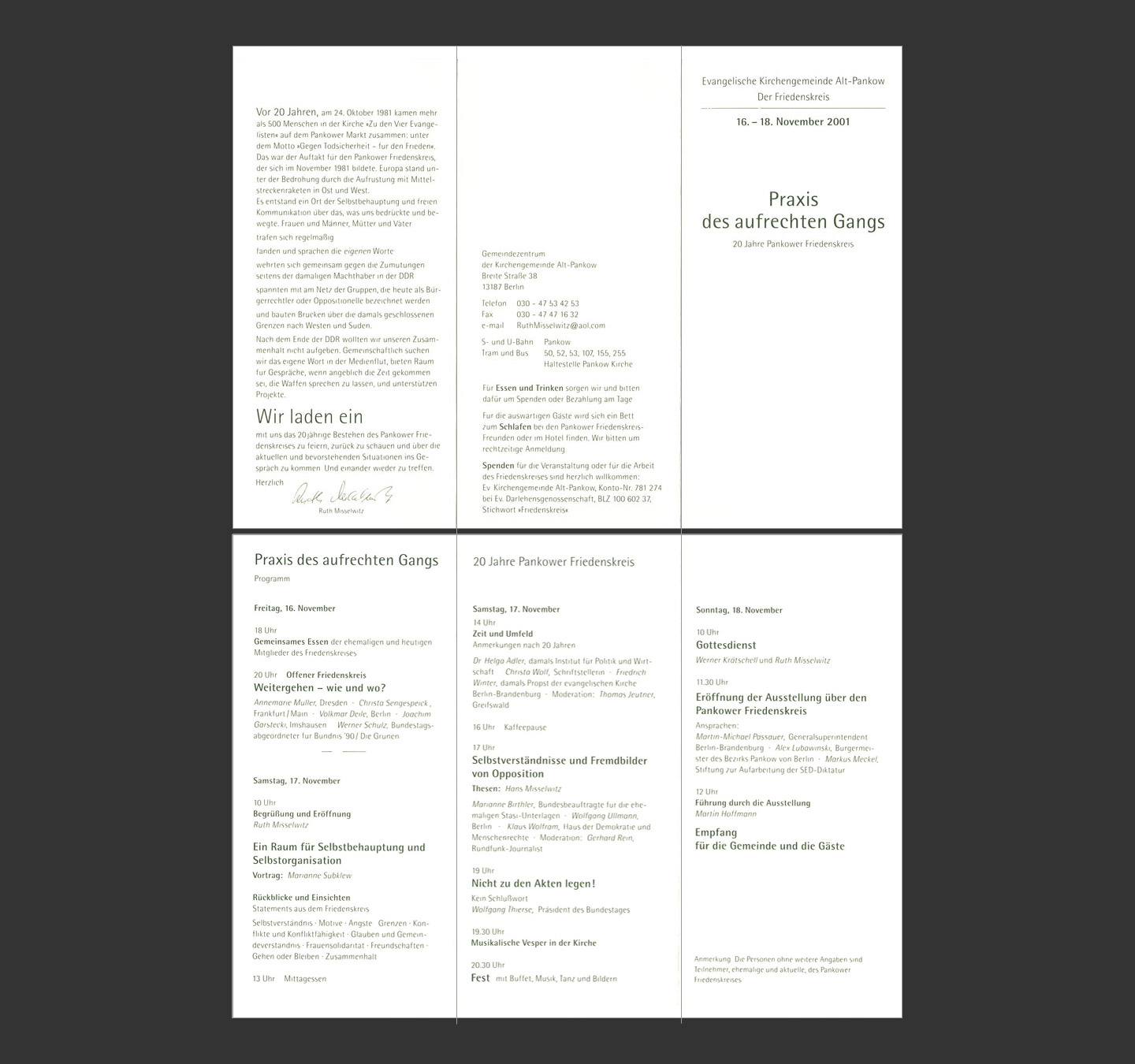 »Praxis des aufrechten Gangs. 20 Jahre Pankower Friedenskreis« mit Christa Sengespeick, Volkmar Deile, Joachim Garstecki, Marianne Subklew, Christa Wolf, Marianne Birthler, Wolfgang Ullmann, Wolfgang Thierse u.a.