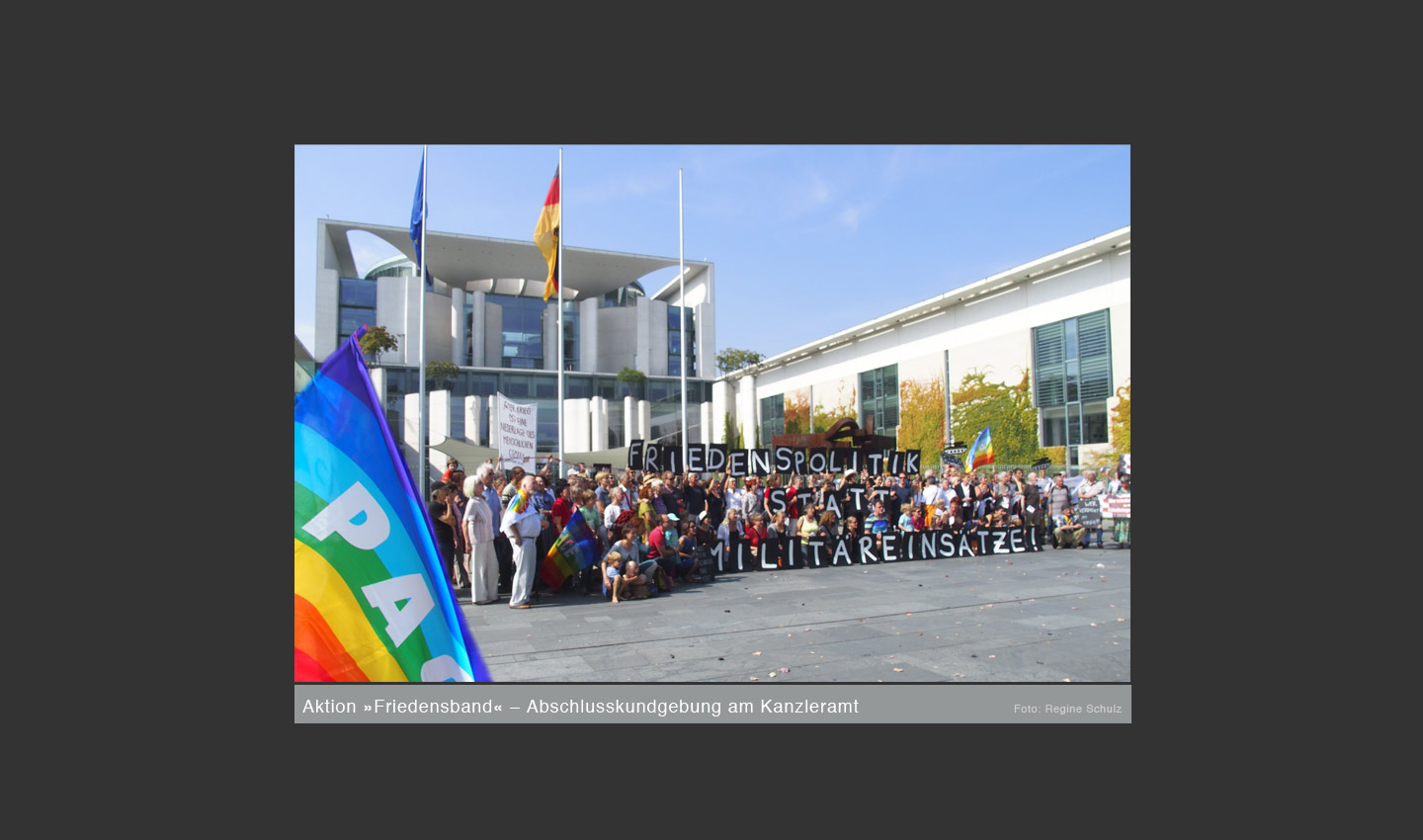 Wir verbanden das bekannteste Denkmal militaristischer Politik – die Berliner Siegessäule – über ein »Friedensband« mit dem Machtzentrum der Bundesrepublik, dem Kanzleramt.